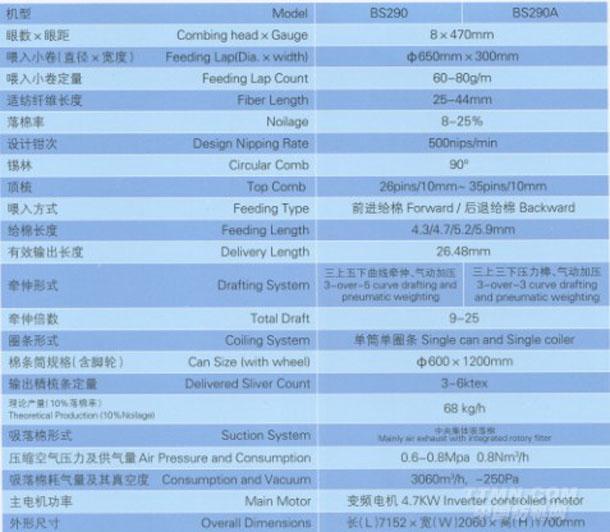 貝斯特BS290/BS290A型精梳機(jī)主要技術(shù)參數(shù)