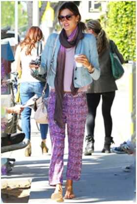 亞歷山大安布羅休身穿印有民族風(fēng)情的棉質(zhì)印花褲子舒適自然,隨之搭配粉紫色漸變的圍巾上下呼應(yīng)很適合春季游園散步哦。