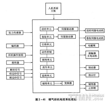 噴氣織機(jī)電控系統(tǒng)目前通常主要控制對(duì)象有:主電動(dòng)機(jī)、剎車制動(dòng)器(或離合制動(dòng)器)、儲(chǔ)緯器、止紗銷、電磁閥、送經(jīng)伺服電動(dòng)機(jī)、(卷取伺服電動(dòng)機(jī))、指示燈等(圖2~41)。