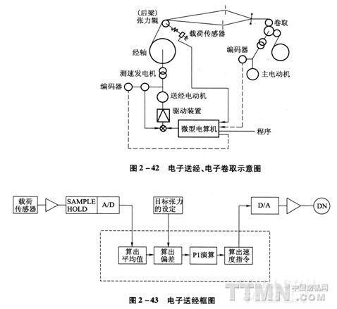 送經(jīng)控制單元負(fù)責(zé)檢測(cè)經(jīng)紗張力信號(hào)、計(jì)算經(jīng)軸直徑大小、按要求控制送經(jīng)伺服電動(dòng)機(jī)的轉(zhuǎn)速和轉(zhuǎn)向。根據(jù)織物對(duì)經(jīng)紗總張力的要求,在人機(jī)界面上設(shè)定經(jīng)紗張力目標(biāo)值、經(jīng)軸直徑的初始值和織物緯密。開(kāi)機(jī)后送經(jīng)機(jī)構(gòu)按緯密對(duì)經(jīng)紗的需求量送出定量的經(jīng)紗,由與經(jīng)紗張力輥(后梁)連接的張力傳感器檢測(cè)經(jīng)紗的實(shí)際張力,由計(jì)算機(jī)對(duì)檢測(cè)的張力值處理后與設(shè)定值比較,通過(guò)PID演算來(lái)控制送經(jīng)伺服電動(dòng)機(jī)的動(dòng)作,達(dá)到恒張力送經(jīng)的目的。在恒張力送經(jīng)時(shí),可以隨時(shí)精確計(jì)算出經(jīng)軸直徑,將計(jì)算值替代初始值或前一計(jì)算值(圖2—42~圖2—43)。