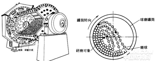 球磨機(jī)主要由傳動(dòng)裝置、筒體裝置、給料裝置、卸料裝置及電氣控制裝置等組成。設(shè)備運(yùn)行時(shí)由電氣控制裝置驅(qū)動(dòng)電動(dòng)機(jī),然后再通過減速機(jī)及周邊大此輪的減速傳動(dòng),拖動(dòng)筒體裝置回轉(zhuǎn)。筒體裝置內(nèi)部裝有的物料和研磨體在回轉(zhuǎn)時(shí)產(chǎn)生的離心力和摩擦力的作用下,被提升至一定高度后沿近似拋物線的軌跡落下來沖擊和研磨筒體底部的另一部分物料,并產(chǎn)生一定的軸向運(yùn)行促使物料研磨和混合均勻。研磨完成的物料最后通過卸料裝置排除筒體,以進(jìn)行下一段工序處理。研磨工藝如下圖1所示。