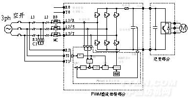 PWM整流回饋部分將三相交流電整流為直流電向直流母線電路供電,直流電路向驅(qū)動電機(jī)的逆變器供電。直流電路可以只連接一個逆變單元,也可以連接多個逆變單元,具體用戶可以靈活配置。