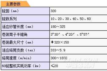 卷裝筒子: 圓錐形卷裝筒子,半錐角:3o30、4o20、5o57 卷繞規(guī)格:寬度150mm最大卷裝直徑320mm