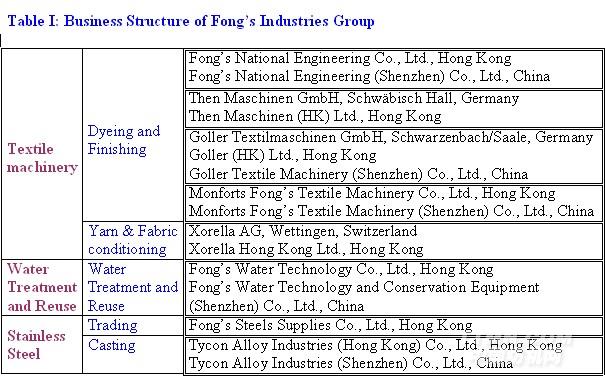Founded in 1963, Fong’s Industries Co., Ltd. (“Fong’s Industries”) is a listed company on the Stock Exchange of Hong Kong. Fong’s Industries operates as a group of companies (table I) with its subsidiaries including FONG’S NATIONAL, THEN, GOLLER, XORELLA, MONFORTS FONG’S, FONG’S STEELS and TYCON ALLOY, who are principally engaged in the manufacture and sale of textile dyeing and finishing machinery, trading of stainless steel supplies and manufacture and sale of stainless steel casting products.