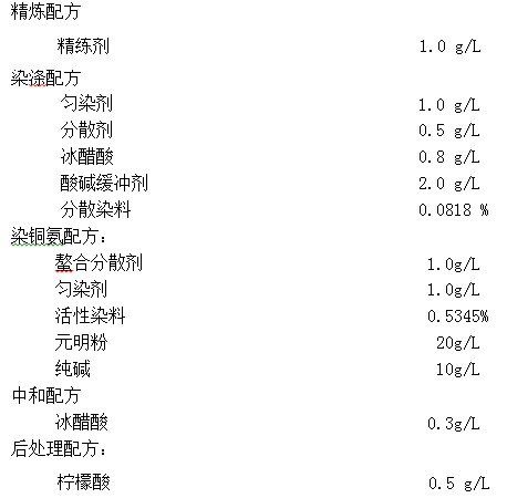 染銅氨纖維:60℃×30min,銅氨纖維與黏膠纖維性質(zhì)類似,上染速率快,因此采用三次加鹽三次加堿工藝。