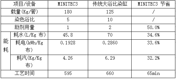 3 結(jié)果分析該種 AIRCOOL 針織面料作為功能型面料的一種,該種織物輕薄,布面敏感,在染缸中極易產(chǎn)生勾絲,傳統(tǒng)的加工一般采用大浴比染色來避免染色加工中出現(xiàn)折痕,勻染性問題。