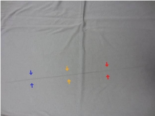 色折痕,又稱行機(jī)痕,水痕,直條痕等(見圖一)。主要是因為織物在染機(jī)繩狀運(yùn)行時,經(jīng)向折迭部分長時間沒有換位,造成起折部分顏色比其它部分偏深所致。組織結(jié)構(gòu)比較緊密的平紋布最容易出現(xiàn)此問題。近年來,一方面隨著針織織機(jī)技術(shù)的飛速發(fā)展,織物的密度越來越高;另一方面隨著紡紗技術(shù)的發(fā)展,質(zhì)量較差的紗也經(jīng)過提高紡紗捻度等用作織造。這樣前道工序中過多的內(nèi)應(yīng)力帶到后序染整加工來,造成織物收縮不一致,織物在運(yùn)行中折迭部分不易換位,最終導(dǎo)致色折痕的產(chǎn)生。