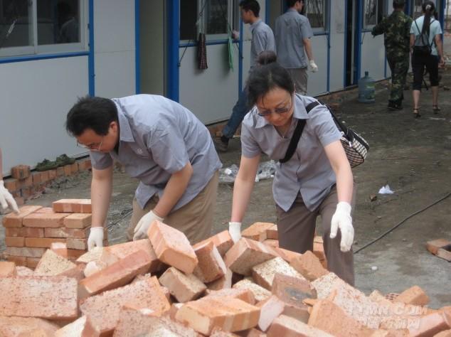 離開(kāi)小漁洞,車(chē)隊(duì)來(lái)到通濟(jì)鎮(zhèn),看望慰問(wèn)了成華區(qū)人武部救災(zāi)指揮駐地的官兵,并在當(dāng)?shù)亟M織開(kāi)展黨員實(shí)踐活動(dòng),以實(shí)際行動(dòng)支援災(zāi)區(qū)的家園重建。六十多名志愿者分成幾個(gè)小組,分別負(fù)責(zé)對(duì)臨時(shí)安置活動(dòng)板房施工現(xiàn)場(chǎng)的安裝材料進(jìn)行歸類(lèi)和場(chǎng)地清理工作,有的手抬肩扛,運(yùn)渣土,抬磚塊,有的拿起鋤頭,鐵鍬等工具平整房間地面,組成愛(ài)心接力,將厚厚的隔墻板等裝修材料傳遞到指定位置。對(duì)臟和累,大家毫無(wú)怨言,只想能盡快搭建起溫暖的家園。中午,為了不給災(zāi)區(qū)增添負(fù)擔(dān),參加活動(dòng)的志愿者個(gè)個(gè)自帶干糧,站在停靠車(chē)隊(duì)的馬路邊匆匆吃完午飯,顧不上休息,又繼續(xù)投入施工現(xiàn)場(chǎng)進(jìn)行清理。