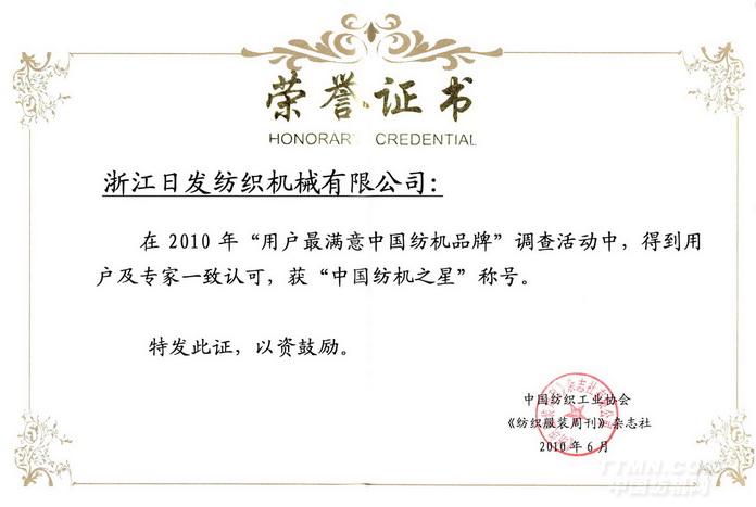 《紡織服裝周刊》主辦的2010年 “中國(guó)紡機(jī)之星”用戶最滿意品牌調(diào)查活動(dòng),在歷時(shí)半年多的時(shí)間,吸引國(guó)產(chǎn)裝備企業(yè)多個(gè)產(chǎn)品領(lǐng)域的近百款設(shè)備參加,經(jīng)過用戶以及專家的客觀評(píng)價(jià),終于塵埃落定。日發(fā)紡機(jī)榮列榜單,被評(píng)為“中國(guó)紡機(jī)之星”。