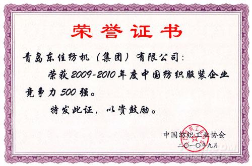 日前,中國紡織工業(yè)協(xié)會在浙江省海寧市勝利閉幕的2009-2010年度中國紡織服裝企業(yè)競爭力500強發(fā)布會上,公布了“2009-2010年度中國紡織服裝企業(yè)競爭力500強”。 青島東佳紡機(集團)有限公司以其良好的經(jīng)營業(yè)績名列其中。
