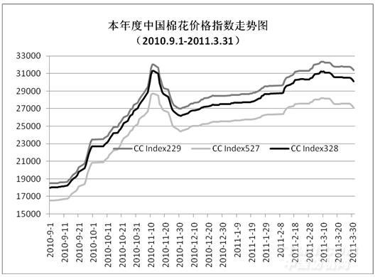 3月國內(nèi)棉花現(xiàn)貨市場先漲后跌。上旬受國際價(jià)格、紡織企業(yè)補(bǔ)庫、棉商惜售等因素影響,持續(xù)小幅上漲;中旬后,日本地震引發(fā)大宗商品市場全面回落,國內(nèi)外期貨行情大幅波動(dòng)回落,對(duì)現(xiàn)貨市場形成壓力,加之紡織企業(yè)經(jīng)營狀況不佳,原料采購更趨謹(jǐn)慎,國內(nèi)棉花價(jià)格不斷下滑,月末已低于月初水平,但月均價(jià)環(huán)比仍上漲近千元。其中CCIndex328級(jí)月均價(jià)30733元/噸,較2月上漲938元/噸,漲幅3.1%,較去年同期上漲15172元/噸,漲幅98%;CCIndex229級(jí)月均價(jià)32630元/噸,環(huán)比上漲1211元,同比上漲16467元。CCIndex527級(jí)均價(jià)為27771元/噸,環(huán)比上漲605元,同比上漲13303元。