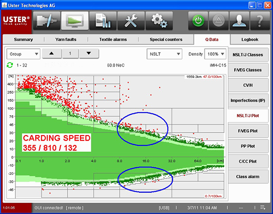 由于紗體一覽圖的出現(xiàn),紡廠能在無需大幅增加切次的前提下清除異常。同樣還有很多例子說明紡廠所設(shè)置的清紗界限范圍太小。多虧了紗體的可視化,紡廠才能糾正這種設(shè)置并能夠減少浪費(fèi)、提升產(chǎn)能,同時(shí)能創(chuàng)造更高的利潤。