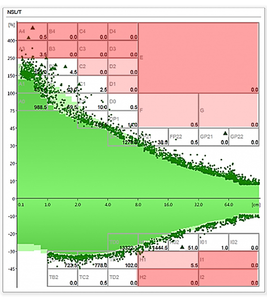圖一_緊密紡紗,使用傳統(tǒng)分級(jí)清紗后仍存在異常(深綠色三角形)