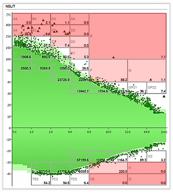 Some millmanagers also reported they had implemented changes to their routines, so thatthey were now checking the YARN BODY randomly during patrols in the mill."The YARN BODY is an indicator of process and raw material situation ifsomething was unusual in the shape or a larger light green area triggered, wecould discuss some improvements," explains a customer in Pakistan. Anumber of mills with higher quality demands also carried out trials to monitorthe changes in the YARN BODY, using scatter plots to find process issues andsuggest improvements. For example (fig. 3 and 4), a mill from India noticed anunusual number of events in the 8 cm to 32 cm area. This triggered investigationsleading to optimum carding speed settings and considerable improvement in cutsand fabric quality.