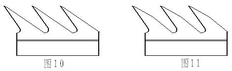 (2)前角α:前角的大小影響針布抓取和握持纖維的能力,也影響纖維梳理、轉移、均勻混合、除雜、伸直等作用。前角大,對纖維束的穿刺、抓取和握持分梳作用增強,生條棉結少,均勻混合作用好,纖維伸直度好。前角小,纖維深入針根的力小,利于纖維的上浮和轉移,錫林和蓋板的針面負荷輕。α過小,轉移率過高,且纖維在錫林齒尖上不能很好地被握持而滑脫,成為浮游纖維,棉結增加,均勻混合不良,伸直度惡化。α加大,盡量滿足分梳的要求,采用矮齒淺齒及道夫采用大前角并增大齒深等措施來解決轉移問題。