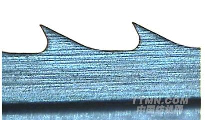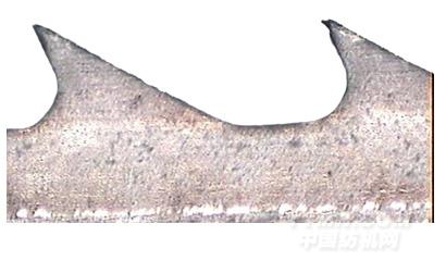 3、如圖所示,是典型的齒尖缺損,是在電鏡放大180倍的照片,齒尖凹凸不平、棱邊不整齊平滑、齒尖毛刺,普通低倍放大鏡是無法檢出的,而棉紡廠手感還誤以為鋒利度極好。這種齒形,凸點先受磨擦,鋒利度很快下降,極不耐磨。