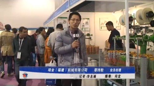 蔡經(jīng)理:觀眾朋友們好,我是福建項全機(jī)械有限公司的,這次參加義烏的展會,我們帶來了一些全新的設(shè)備和一些技術(shù)上的創(chuàng)新,包括面前這臺高速走碼機(jī),機(jī)器型號是16錠的,以前是無線傳的現(xiàn)在改成記碼的,而且機(jī)器自動卷繞,可以節(jié)省人工成本,這是一個創(chuàng)新,節(jié)約人工成本。這邊的是新的紡紗機(jī),在原來的機(jī)型上我們做了一些花色上的創(chuàng)新,經(jīng)過蛇形纏繞。目前這款設(shè)備主要用于服裝、鞋業(yè),包括汽車的坐墊和靠墊,包裝袋延繩都是可以的。我們這些設(shè)備的梳理,無極調(diào)速這些都是在行業(yè)里領(lǐng)先的。在客戶提出的要求的基礎(chǔ)上針對客戶的需求進(jìn)行開發(fā),目前在市場的各個行業(yè)都有蠻多的應(yīng)用。謝謝大家!