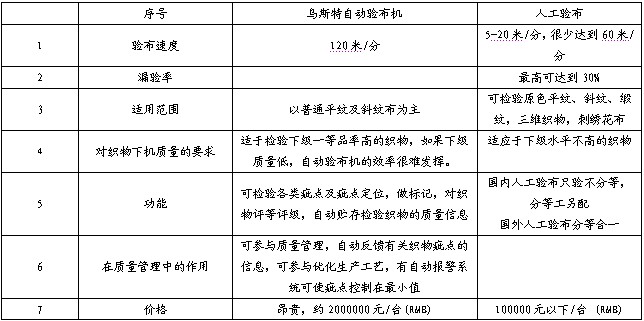 烏斯特驗(yàn)布系統(tǒng)與人工驗(yàn)布從目前生產(chǎn)實(shí)踐上看各有優(yōu)缺點(diǎn)(見(jiàn)表1),但從發(fā)展的眼光看,烏斯特自動(dòng)驗(yàn)布機(jī)將逐步隨著時(shí)間發(fā)展,顯示出更多的優(yōu)勢(shì)。