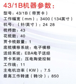 43/1B 花邊機采用國內(nèi)最先進的賈卡和鋼絲多梳結(jié)構(gòu)。使得花邊面料質(zhì)量更加穩(wěn)定可靠,且產(chǎn)量高,操作方便,更換花型簡單?;ㄊ岵捎锚毺氐膯慰刂蒲a償程序,確保了花梳運行的高精確度。是同類產(chǎn)品中性價比最高、且深受用戶喜愛。