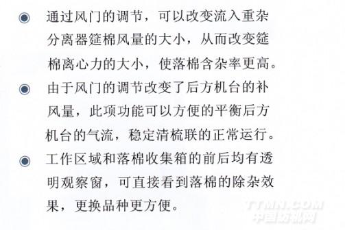2、利用筵棉經(jīng)過180度彎型管道時的離心力作用。去除比重大于纖維的雜質(zhì),同時可減少可紡纖維的損失