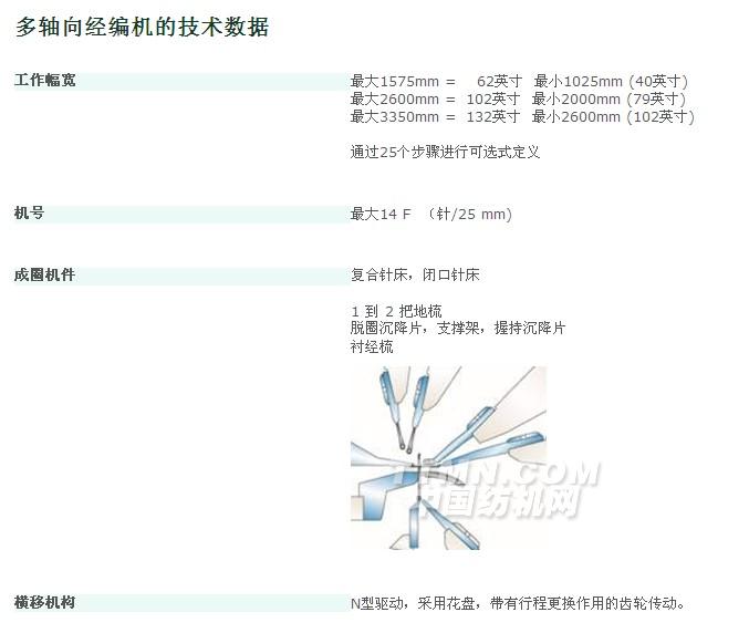 多軸向多層織物由一層或多層平行伸直排列、具有不同取向角度的紗線層組成,其表面結(jié)構(gòu)通過線圈固定。纖維網(wǎng)、未加固的玻璃纖維短切紗、膜帶、泡沫或其他的材料均可以用來與紗線結(jié)合。理想的襯緯和層固定條件可以獲得很高的生產(chǎn)速度和優(yōu)良而均一的織物。