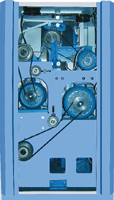 采用四電機分部傳動,替代傳統(tǒng)的錐輪變速機構及換向、成形機構,運用電腦控制和變頻調速驅動等技術進行高精度隨動控制系統(tǒng),使各電機達到最佳的同步控制,以最佳紡紗工藝進行紡紗。