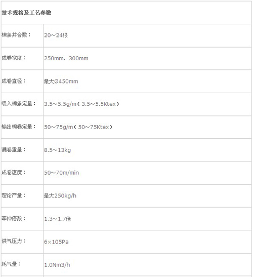 本機用途是使梳棉機供給的棉條,通過并合、牽伸、卷繞成具有一定重量,結構緊密的棉卷,供下道工序使用。