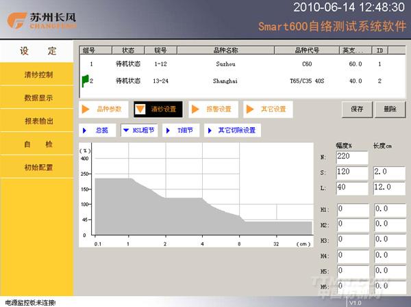 Smart 600電子清紗器主要由主控箱、電容式檢測(cè)頭、處理板、電源轉(zhuǎn)接板及各種電纜和接插件組成。整機(jī)錠數(shù)可按客戶要求配置,最多60錠。