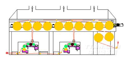 副壓漿輥與上漿輥上方設(shè)有漿液噴淋裝置,獨立的漿泵供應(yīng)漿液。