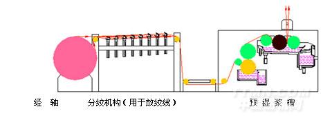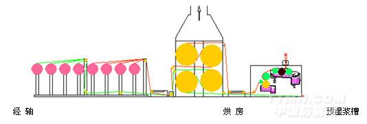 如采用傳統(tǒng)的方法對經(jīng)紗上漿,預(yù)濕機構(gòu)可只做喂入裝置使用,不必更改經(jīng)紗走紗路線。