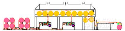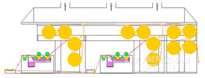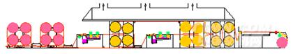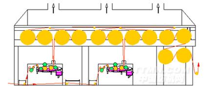 采用高架對(duì)角布局預(yù)烘烘燥機(jī)構(gòu)(專(zhuān)利號(hào): )。由于預(yù)烘烘筒位于漿槽的側(cè)上方,有效減少了出漿槽濕紗長(zhǎng)度,同時(shí)節(jié)省了設(shè)備安裝場(chǎng)地。