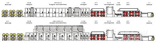 本系列漿染聯(lián)合機(jī)主要是為了適應(yīng)于靛藍(lán)、硫化等直接染料對5~32S純棉及其混紡織物的經(jīng)紗冷、熱染、套色及上漿,具有連續(xù)漂、染、漿的特點(diǎn)。