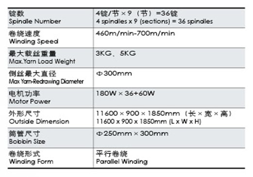本機(jī)是化纖捻機(jī)的后道設(shè),把倍捻機(jī)上的卷取筒子倒成大卷裝,與無(wú)梭織機(jī)配套以減少停機(jī)時(shí)間,提高功效。