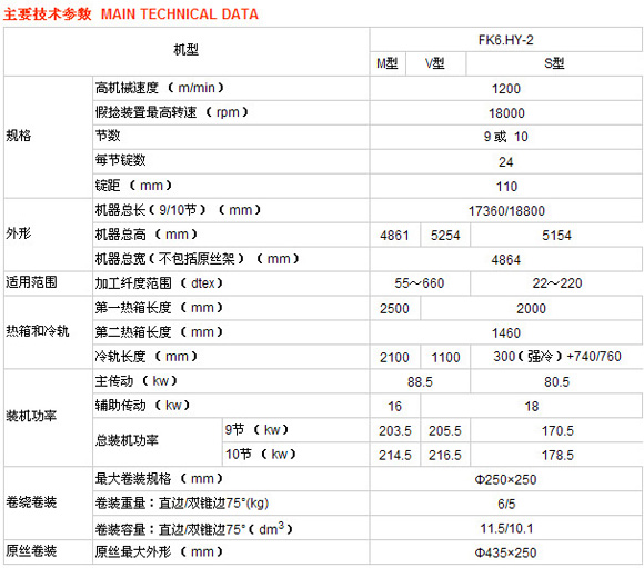 FK6.HY-2型高速彈力絲機(jī)主要用于合股絲、無捻絲的生產(chǎn),也可用于單絲道S捻或Z捻的加工,其A、B兩面均采用獨(dú)立的傳動(dòng)和加熱方式,可分別加工相同或不同的品種,以提高其使用價(jià)值,最高機(jī)械速度為1200米/分,適紡范圍為滌綸55~660dtex,錦綸22~220dtex。