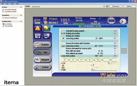 A9500噴氣織機(jī)應(yīng)用了最先進(jìn)的技術(shù),采用最新式的電子平臺(tái)——全彩觸摸屏,作為用戶操作界面。直觀的操作軟件方便操作者和技術(shù)人員進(jìn)行操作。生動(dòng)的圖標(biāo)輕松指引用戶進(jìn)入想要的界面,使操作者更容易上手。