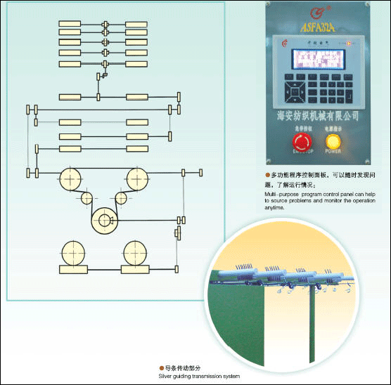 此機(jī)型具有速度高、結(jié)構(gòu)新穎、質(zhì)量穩(wěn)定等特點(diǎn)。采用高架順向積極喂人,搖架彈性加壓,全新的三上三下上托式防積塵壓力棒雙區(qū)曲線牽伸形式不僅對浮游纖維的控制力增強(qiáng),而且有利于解決因壓力棒積塵而造成的紗疵問題;廣泛采用同步帶、平皮帶,三角帶傳動,增加傳動柔韌性,降低噪聲,減少傳動級數(shù),傳動輕快、平穩(wěn),有效消除傳統(tǒng)并條機(jī)的漏油和發(fā)熱等問題;主牽伸和后區(qū)牽伸相對獨(dú)立,牽伸倍數(shù)調(diào)節(jié)方便;采用真空吸塵及上下清潔裝置,吸風(fēng)量大,并可調(diào)節(jié),保證棉條通道的清潔,減少飛花積聚;上清潔采用浮動金屬棒,抗靜電、散熱性好,清潔效果好,全機(jī)清潔系統(tǒng)可靠,減少了紗疵;該機(jī)機(jī)電一體化程度高,電氣控制采用專用可編程器控制,采用觸摸式操作面板,并實(shí)時顯示機(jī)器的運(yùn)行故障情況。