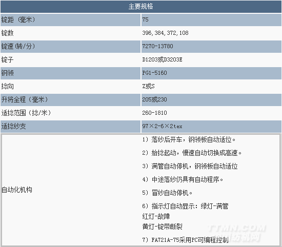●本機(jī)適用于棉紗纖維,棉與化學(xué)纖維混紡紗的捻線(xiàn)加工,供機(jī)織和針織用線(xiàn)。