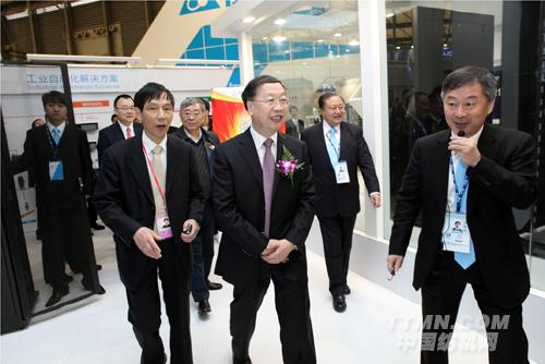 工業(yè)和信息化部副部長蘇波(前排中)在臺達(dá)集團(tuán)創(chuàng)辦人暨董事長鄭崇華先生(右2)的陪同下參訪臺達(dá)展位