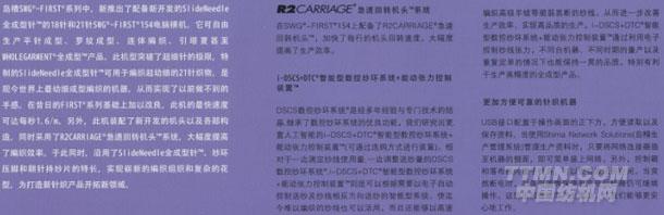 島精SWG-FIRST系列中,新推出了配備新開發(fā)的SlideNeedle全成型針的18針和21針WG-FIRST154電腦橫機(jī)。配備R2CARRIAGE急速回轉(zhuǎn)機(jī)頭系統(tǒng),I-DSCS+DTC智能型數(shù)控紗環(huán)系統(tǒng)+能動(dòng)張力控制裝置,更加方便可靠的針織機(jī)器。