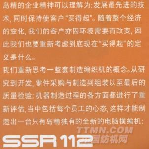島精企業(yè)精神可以理解為;發(fā)展最先進的科技技術,同時保證使客戶“買得起”。隨著整個經濟的變化,我們的客戶亦因環(huán)境需要而改變,因此,我們也要重新考慮到底現在“買得起”的定義是什么。我們從新思考一整套制造編織機的概念,制造出一臺只有島精獨有的全新的電腦橫機:SSR112。