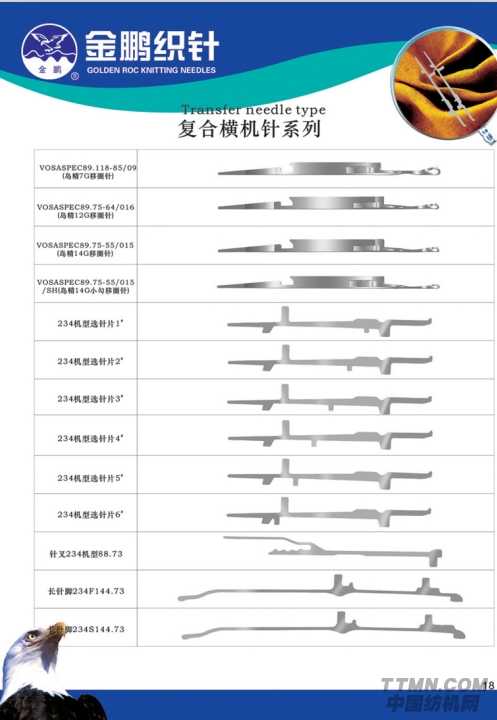 復合橫機針則包括VOSASPEC89.118-85/09(島精7G移圈針)、VOSASPEC89.75-64/016(島精12G移圈針)、VOSASPEC89.75-55/015(島精14G移圈針)、VOSASPEC89.75-55/015/SH(島精14G小勾移圈針)、234機型選針片1’至6’、針叉234機型88.73、長針腳234F144.73及長針腳234S144.73共13種復合橫機針。