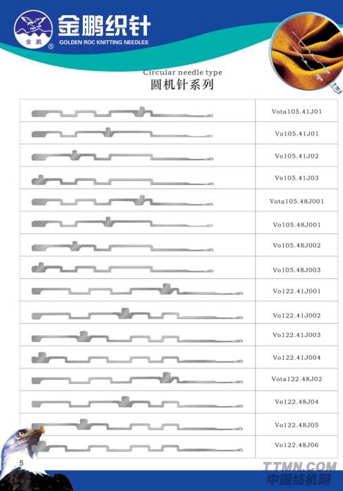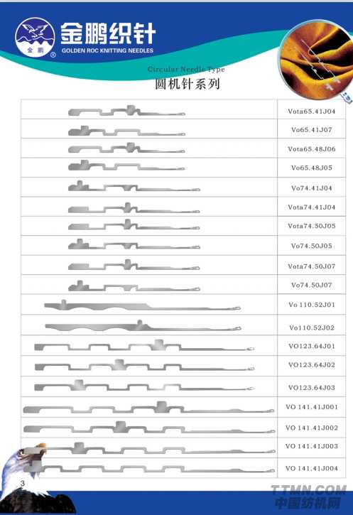 其中圓機針系列包括Vota65.41J04、VO74.41J04、V0110.52J01等35款不同型號的圓機針。