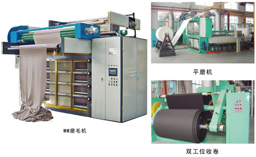 MW、MM系列多輥平磨機,設有6~12支磨輥,采用多輥多次不同砂皮介質(zhì)對織物表面進行磨削加工,達到表面光澤一致,并具獨特風格的絨面。最新開發(fā)的MP立式磨毛機可同時磨削正反兩面,附加氣流除塵,實現(xiàn)雙面磨毛、清除皮粉一次完成,效率比同類設備高3倍以上。