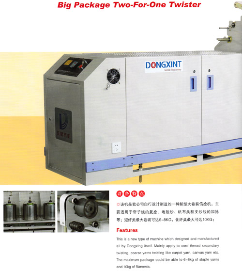 該機(jī)是我公司自行設(shè)計(jì)制造的一種新型大卷裝倍捻機(jī),主要適用于簾子線的復(fù)捻、地毯紗、帆布類粗支紗線的加捻等;短纖類最大卷裝可達(dá)6—8KG,化纖類最大可達(dá)10KG