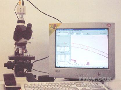 本系統(tǒng)從光學(xué)系統(tǒng)來獲得圖像,將被測(cè)物體放在顯微鏡的載物臺(tái)上,CCD用來代替顯微鏡的目鏡,CCD的視頻線接在大恒圖像卡上的復(fù)合輸入視頻線的一根上。打開顯微鏡的光源,調(diào)整焦距,得到一個(gè)清晰的像,CCD攝取圖像,通過視頻線傳到圖像卡中,經(jīng)過A/D轉(zhuǎn)換,將圖像顯示在屏幕上,通過圖像的測(cè)量軟件可以開始測(cè)量,可以得到測(cè)量的數(shù)據(jù)、紗線的平均直徑、紗線的變異系數(shù)以及紗線的誤差。