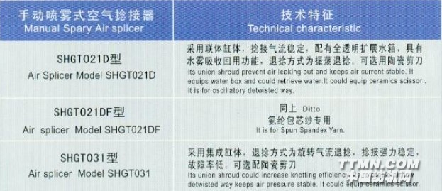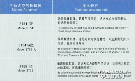 近年來(lái),我公司又不斷創(chuàng)新,開(kāi)發(fā)了具有當(dāng)代水平的ST551、SHGT031空氣捻接器。該空捻器擺脫了原有振蕩退捻的模式,采用獨(dú)特的氣旋退捻方式,保障了紗線接頭強(qiáng)力的穩(wěn)定性,且維修率大幅度下降,后期維修費(fèi)用可節(jié)省60-80%,具有極好的使用價(jià)值。產(chǎn)品性能達(dá)到或超越了國(guó)際同類產(chǎn)品的水平,并獲得了多項(xiàng)國(guó)家專利。