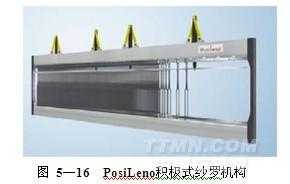 a.采用 Groz-Beckert公司新推出的 PosiLeno®積極式控制紗羅系統(tǒng),通過(guò)綜框運(yùn)動(dòng)帶動(dòng)全幅紗羅 (圖 5—16)。過(guò)去消極式紗羅織造機(jī)構(gòu)將紗羅綜片安裝在綜框上,由綜框傳動(dòng)、彈簧回綜,結(jié)構(gòu)簡(jiǎn)單、運(yùn)動(dòng)時(shí)沖擊大 (圖 5—17),只能適應(yīng)較低的織造速度。新型的 PosiLeno積極式紗羅機(jī)構(gòu)將紗羅綜片安裝在 1片綜框上,另一片綜框通過(guò)鉸接的連桿傳動(dòng)紗羅綜片。這種結(jié)構(gòu)適應(yīng)更高的織造速度,生產(chǎn)效率成倍提高,為劍桿織機(jī)織造紗羅織物提供了簡(jiǎn)單易用的方案;