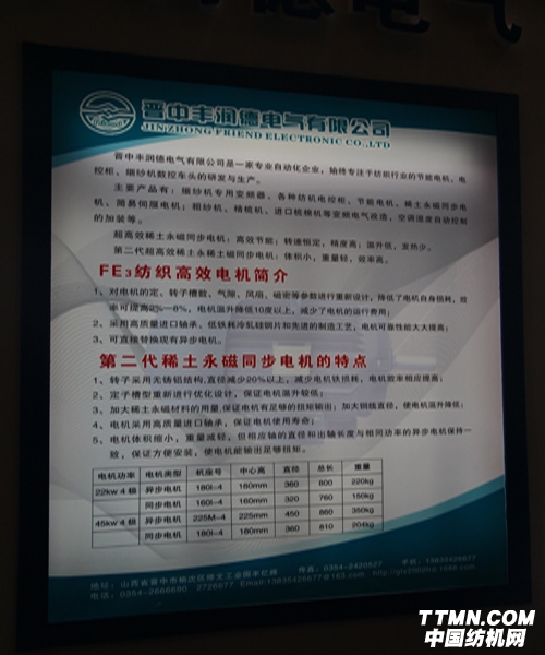 2014中國(guó)國(guó)際紡織機(jī)械展覽會(huì)暨ITMA亞洲展覽會(huì)上,晉中豐潤(rùn)德電氣有限公司重磅推出了FE3紡織高效電機(jī)和第二代稀土永磁同步電機(jī)。