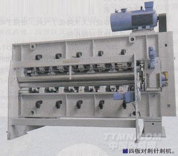 四板對刺高速針刺機應用于生產皮革基布、過濾材料基布、汽車用氈毯和壁毯、上上布復合膜等,填補了國內空白。其核心技術及創(chuàng)新點在于:四針板正位對刺,雙板正位對刺;在線調整針剌深度,開放式無曲軸箱,齒輪導向;人性化設計,針板氣囊夾緊便于更換;生產線配置中減少了每個單元機之間對布的牽伸,同等針剌強度要求下針剌密度下降;可用于預刺、主針剌、修而等。