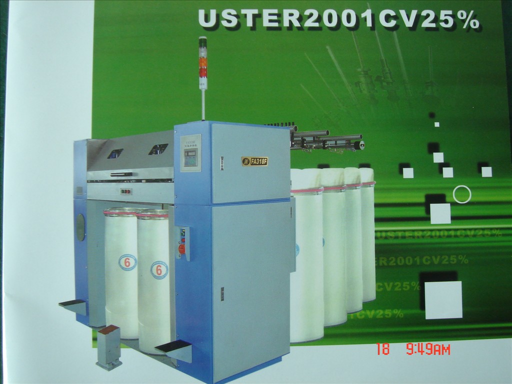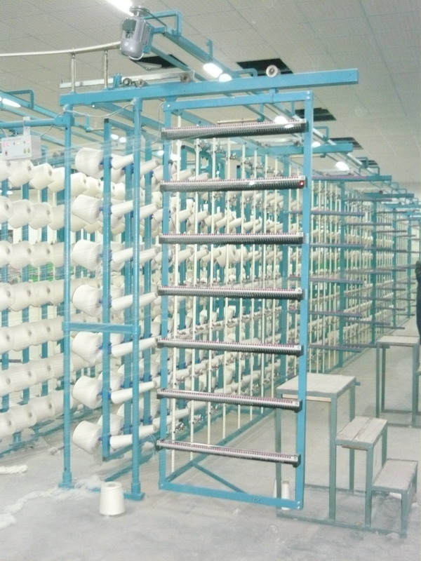 12.筒子架:筒子架形式有矩型筒子架、小V型筒子架。兩種形式筒子架插筒子的轉(zhuǎn)框安裝形式有固定式、回轉(zhuǎn)式兩種。固定式轉(zhuǎn)框是一側(cè)插筒子;轉(zhuǎn)框式是二側(cè)插筒子,一側(cè)筒子工作是,另一側(cè)可插入預(yù)備筒子,一側(cè)筒子工作結(jié)束后,轉(zhuǎn)框回轉(zhuǎn)180,預(yù)備紗錠將紗線引出即可工作,提高了整經(jīng)機的有效工作時間。筒子架的轉(zhuǎn)框是回轉(zhuǎn)式(二面插筒子),張力機構(gòu)的張力片是順出紗方向出紗張力。張力需調(diào)整時,即可調(diào)整張力器的包圍角來改變張力。